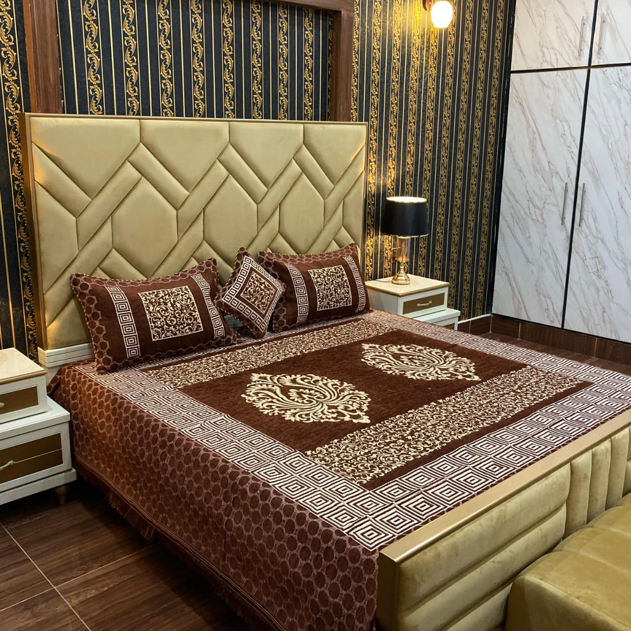 A velvet jacquard bedsheet combines the plush softness of velvet with intricate jacquard-woven patterns for a luxurious, textured look. Its elegant design and rich colors add sophistication to any bedroom, offering unmatched comfort and style. Perfect for cozy, stylish living.
